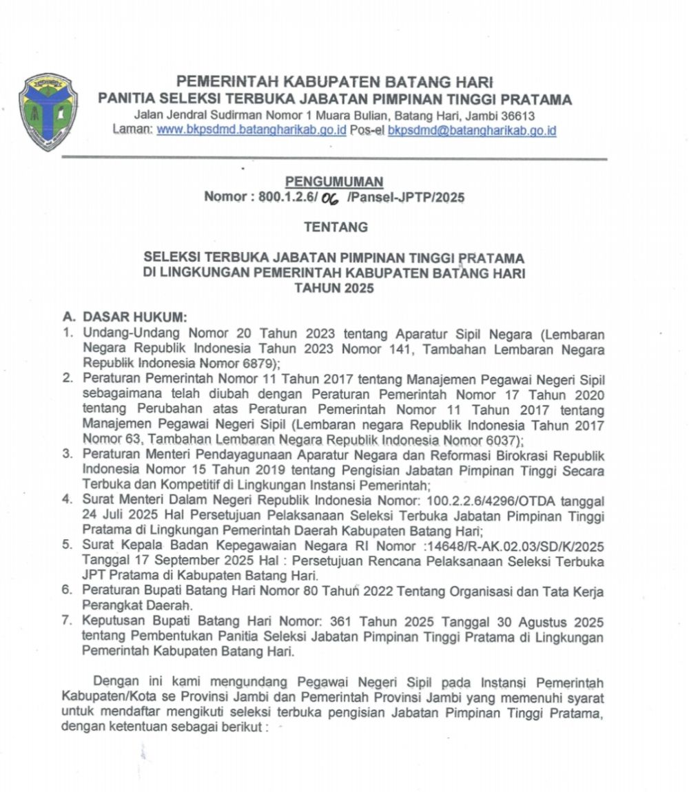 Batanghari – Pemerintah Kabupaten (Pemkab) Batang Hari, membuka seleksi Jabatan Pimpinan Tinggi (JPT) Pratama.