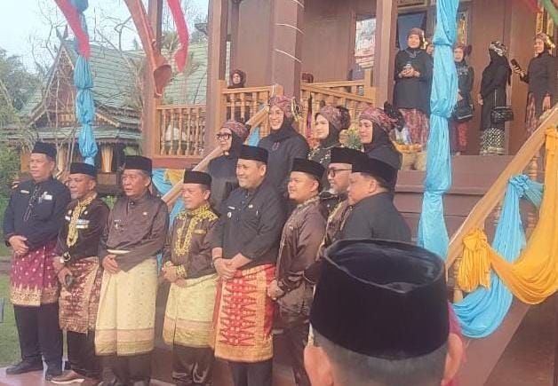 Menariknya Bupati Merangin H M Syukur bersama Ketua TP PKK Hj Lavita Syukur, dalam penyambutan tamu di Anjungan Merangin tersebut, melibatkan puluhan emak-emak yang berjejer di depan pintu masuk, sembari melantunkan lagu ‘Pangkalan Jambu’.