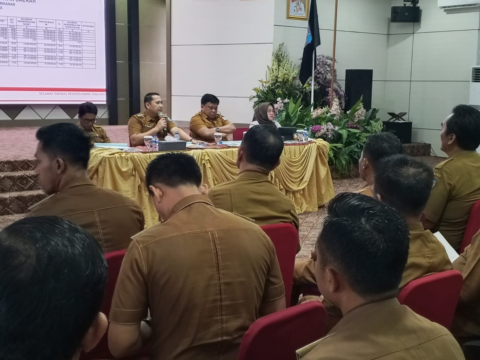 Rapat evaluasi ini dihadiri oleh seluruh pimpinan OPD di lingkungan Pemkab Merangin serta para Camat se-Kabupaten Merangin. Turut mendampingi, Sekretaris Daerah Zulhifni dan Asisten 3 Setda Merangin Hennizor. (Abyan/tugas/iqbal)