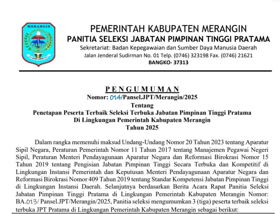 “Berdasarkan Berita Acara Rapat Panitia Seleksi Jabatan Pimpinan Tinggi Pratama di Lingkungan Pemerintah Kabupaten Merangin Nomor: BA.013/ Pansel.JPT/Merangin/2025, Panitia seleksi mengumumkan 3 (tiga) peserta terbaik,”kata Ferdi Firdaus Kepala BKPSDMD menyampaikan ke media, Jumat sore (16/1/2026) menyampaikan ke media.