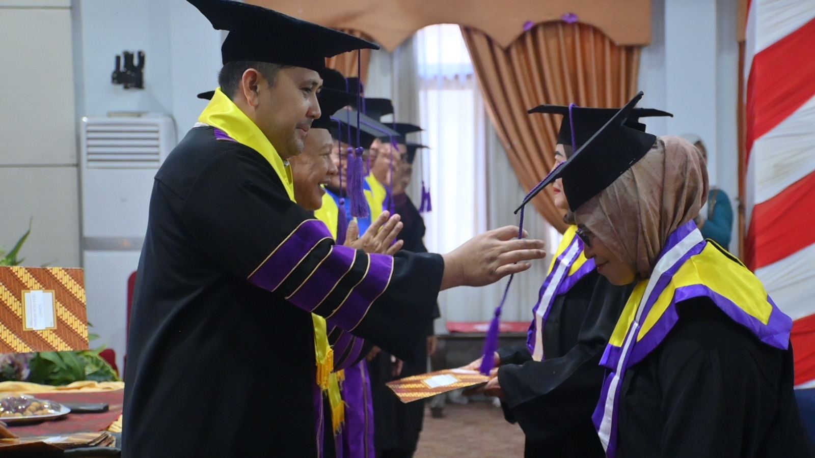 Mbah Wiji (97) dari Desa Pelakar Jaya Kecamatan Pamenang menjadi wisudawati tertua. Meski telah memasuki usia senja, langkahnya masih tegap mengenakan toga.